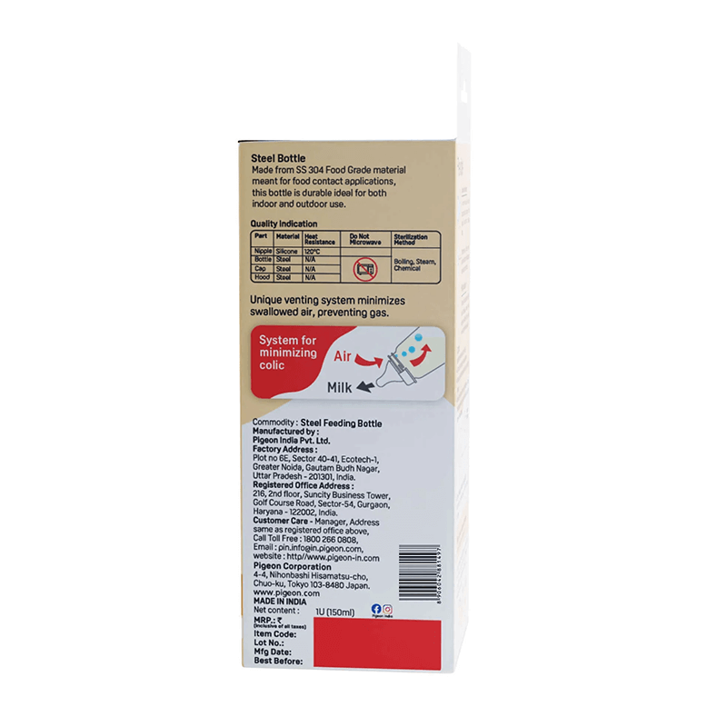 Introducing the Steel Feeding Bottle, the Pigeon Premium Steel Feeding Bottle is designed for your baby’s comfort. The advanced venting system and anti-colic feature help prevent air intake and minimize swallowed air, ensuring a smooth feeding experience.